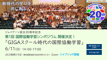 ジェイアーン設立20年を記念するこのシンポジウムは、基調講演として、「GIGAスクール時代のデジタル・シティズンシップ教育」をテーマに豊福晋平氏にご講演をいただきます。実践報告は、SDGsに関連する小・中・高・大学での国際協働学習の実践発表を行います。パネルディスカッションでは、パネリスト5名の方々に、実践報告へのコメントをいただき、国際協働学習に取り組む意義についてなど、国際協働学習の可能性を展望する機会にできればと願っています。さらに、懇親会も実施しますのでぜひご参加ください。 |